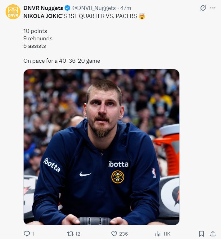 北京时间11月9日,丹佛掘金大胜印第安纳步行者拿到四连胜。此役约基奇的个人表现又相当的炸裂,三节就完成20+三双,全场比赛仅31分钟拿到32分14助攻14篮板8失误,约基奇已经是完完全全的三双魔兽。