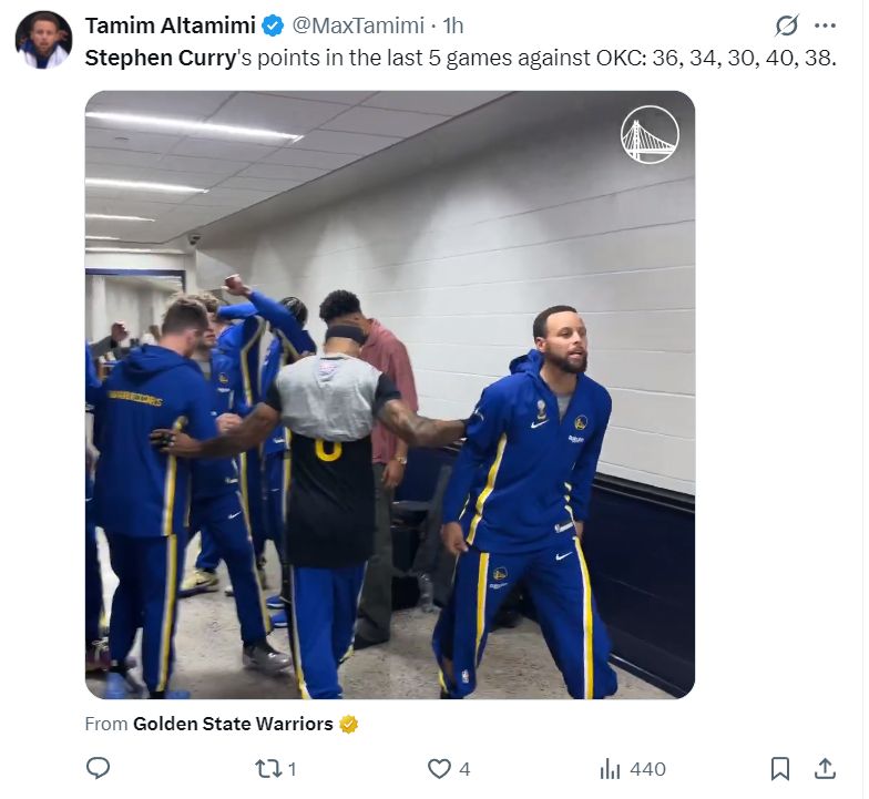 赛前勇士媒体写道,库里最近五次打雷霆:36分、34分、30分、40分、38分,也就是五连30+,但此役后这个纪录就中断了。