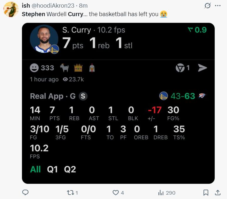 末节库里没有登场,全场比赛20分钟,13中4,三分5中1,罚球3中2,拿到11分1篮板0助攻1抢断5犯规,命中率30.8%,三分命中率20%,正负值-23,库里被迫打卡下班。