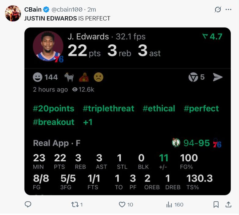 在比赛进入决胜三分钟前,爱德华兹23分钟,8中8,三分5中5,罚球1中1,拿到22分3篮板3助攻1抢断,命中率100%,真实命中率130.3%,他就是费城反超的超级功臣。