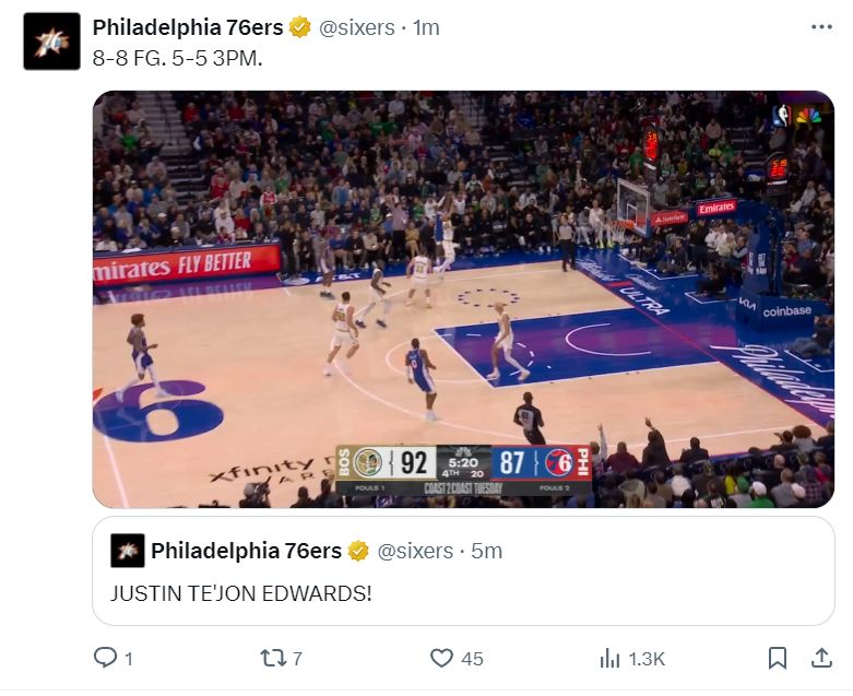 又是保罗-乔治扎心的夜晚,费城76人又有一位锋线爆发了,他就是21岁的贾斯汀-爱德华兹,在对阵绿凯的比赛中,这位身高6尺7的前锋成为超级奇兵,前8次出手全部命中,全场比赛27分钟9中8+三分6中5,他帮助费城在主场击退绿凯。