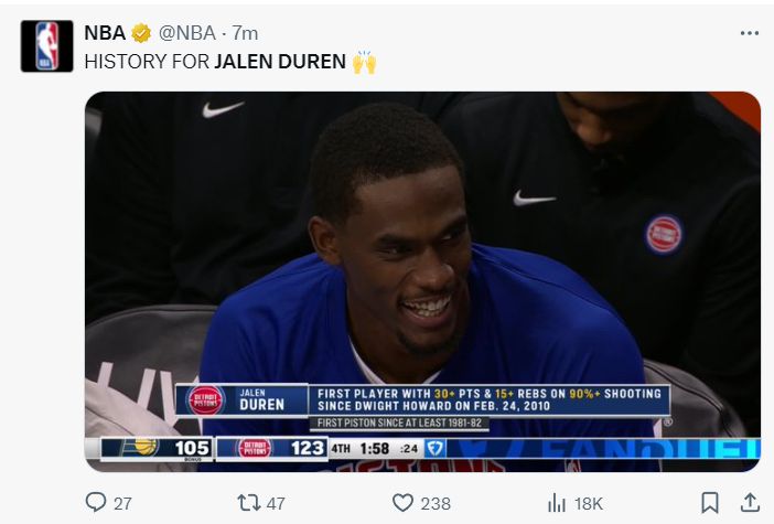 NBA官方指出,杜伦成为2010年德怀特-霍华德后首位命中率超过90%拿到30+15的球员。