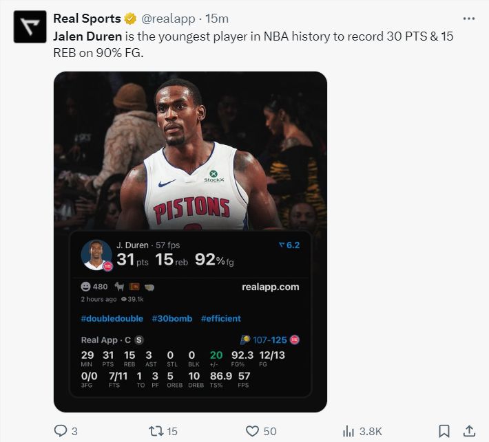 活塞这一波10连胜以后已经稳居东部第一,13胜2负仅次于雷霆,谁能想这支如此年轻的球队能一飞冲天,除了坎宁安的进化之外,杰伦-杜伦的进攻也非常关键。