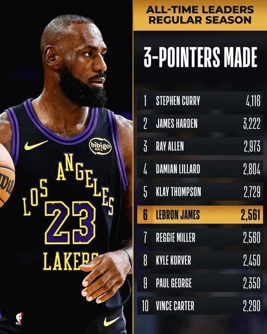 其二,詹姆斯生涯三分命中数超越雷吉-米勒,升至NBA历史第六。