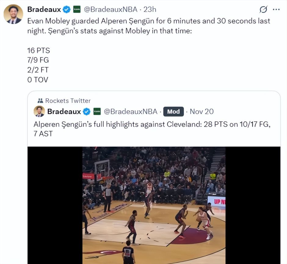 火箭大胜骑士,申京在面对DPOY内线埃文-莫布利时9中7,罚球2中2,拿到16分0失误,可以说申京是吊打莫布利,莫布利是2021届探花,申京是2021届16顺位。