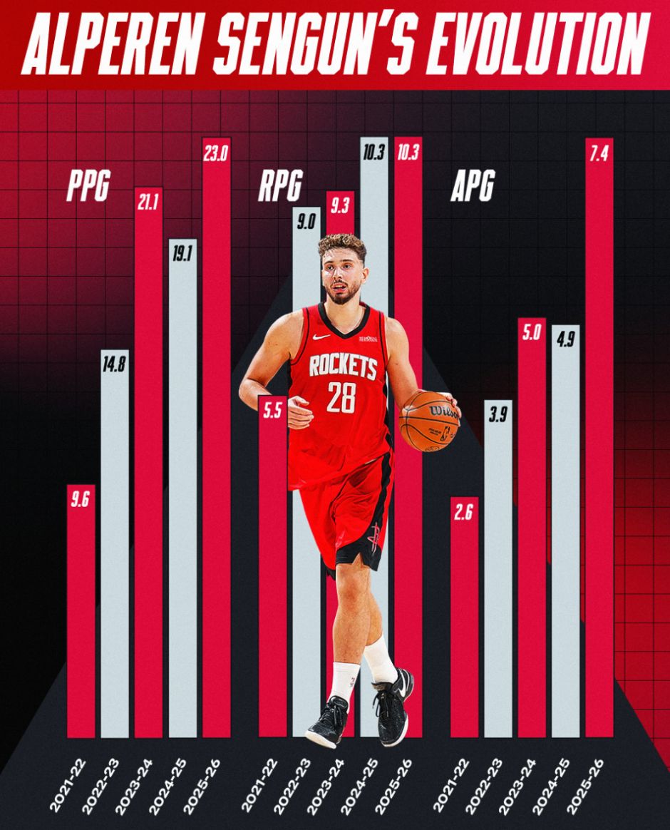 申京这位土耳其内线,进入联盟后每一个赛季都在进步,本赛季的进步最为明显,得分是生涯新高,助攻也是生涯新高,而且助攻场均高达7.4次,申京的进步成为火箭队本赛季攻防一体豪强的关键所在。