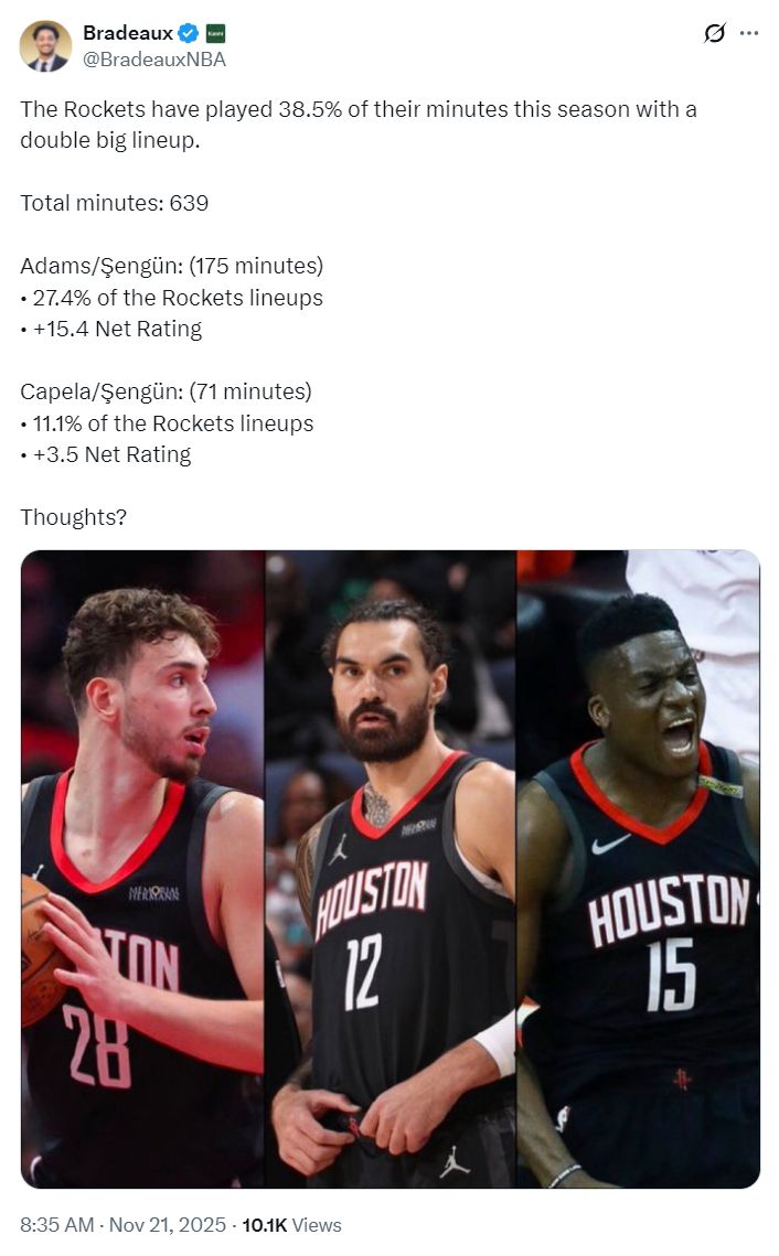 本赛季火箭队的阵容有38.5%的时间是用双塔来打的,申京/亚当斯合计175分钟,占比阵容27.4%的时间,净效率值+15.4%;申京/卡佩拉合计71分钟,占比阵容11.1%的时间,净效率值+3.5。