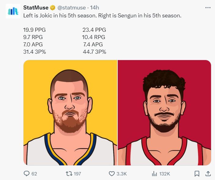 美媒StatMuse写道,申京与约基奇生涯第五个赛季的数据对比,约基奇场均19.9分9.7篮板7助攻,三分命中率31.4%;申京场均23.4分10.4篮板7.4助攻,三分命中率44.7%,很明显申京已经超过了同期约基奇。