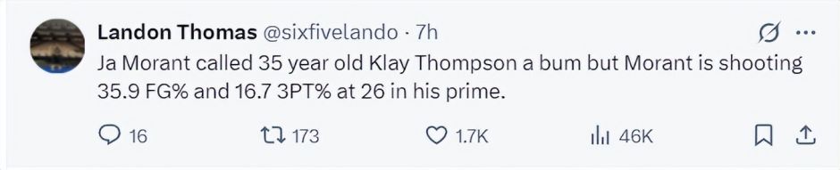 赛后独行侠记者Landon Thomas写道:莫兰特说35岁克莱是流浪汉、废人。但26岁的莫兰特本赛季场均命中率35.9%,三分命中率16.7%。