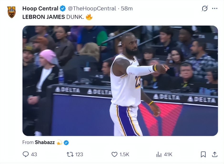 首节老詹是3中1,进入第二节一度是7中1的开局,但随后的三次运动战全部命中了,包括上篮、暴扣、翻身跳投,第二节他8中4拿到8分4篮板5助攻,他反击完成快攻暴扣后霸气的指了一下地板。