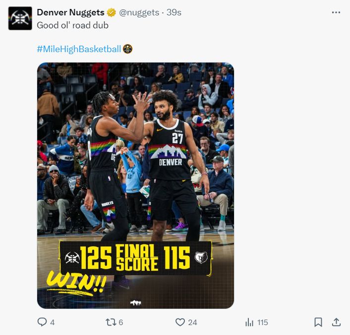 北京时间11月25日,掘金125-115大胜灰熊避免连败,这场比赛后掘金拿到13胜4负的战绩重返西部第二,湖人队12胜4负下滑到西部第三。此役灰熊的核心莫兰特继续高挂免战牌,掘金在约基奇的带领下一直手握微弱领先,末节灰熊的反扑气焰也被约基奇浇灭。