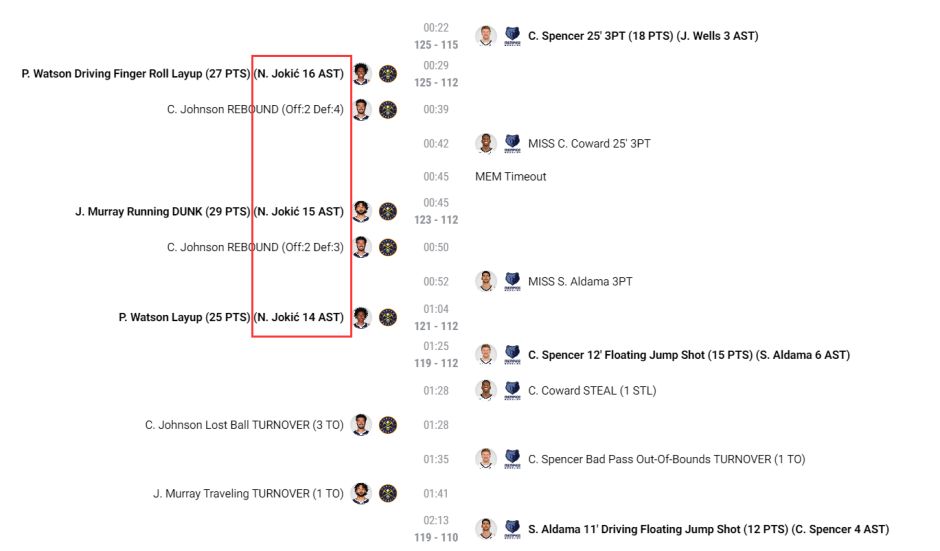 3.约基奇生涯第33次15+助攻,其余的中锋合计只有14次;