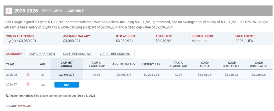 奥科吉今夏以一年230万的底薪加盟火箭,没想到他一来就成为了球队的核心轮换,更没想到他的轮换席位在谢泼德之前,乌度卡最喜欢的就是那种防守搏命的球员,恰好奥科吉就是这样的球员,他太适合火箭的体系了。