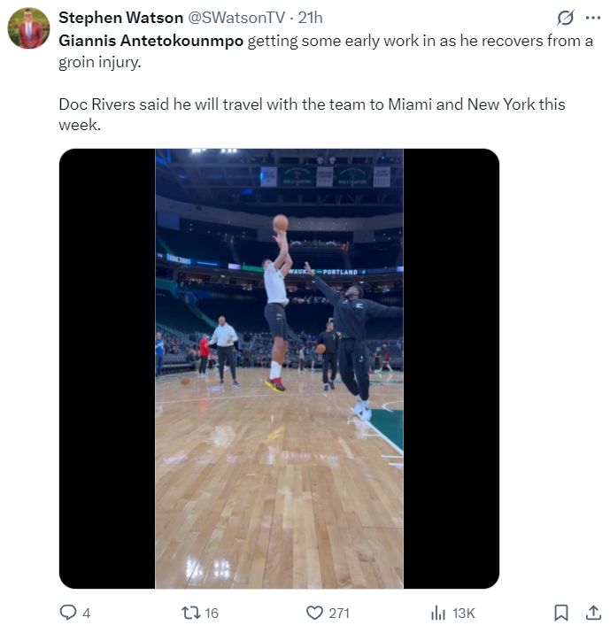 根据道格-里夫斯的说法,扬尼斯在腹股沟受伤的初期就已经开始恢复日常训练,接下来雄鹿的客场之旅字母哥也会随队,根据Shams的报道扬尼斯是腹股沟一级拉伤,恢复时间是1-2周。