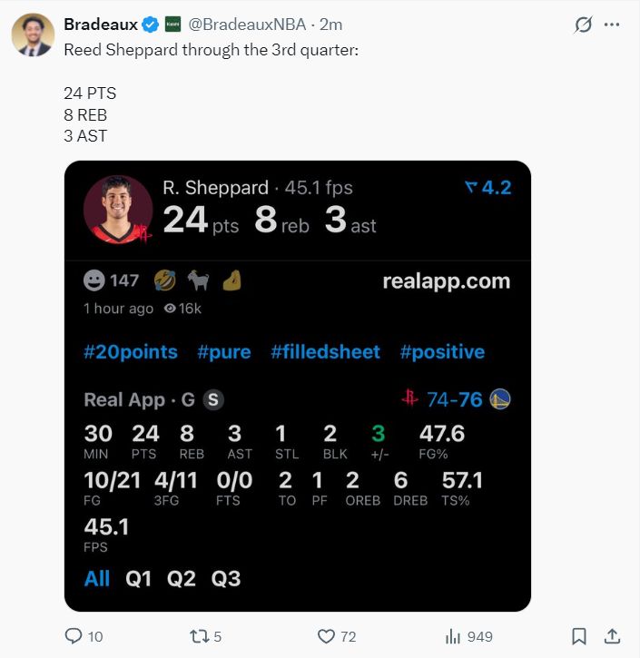 第三节火箭是追分的一节,谢泼德也是追分的第一功臣,在申京被追梦完全冰封的情况下,谢泼德单节8中4+三分3中1拿到9分4篮板1助攻1抢断,迎着波斯特三分命中,抢断后又转换三分命中,他这一节帮助火箭疯狂追分。
