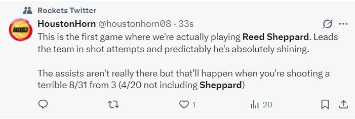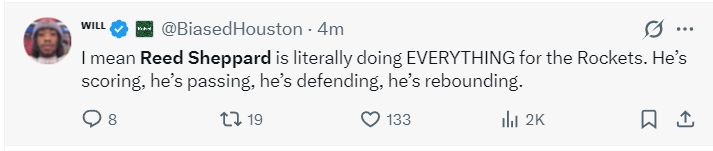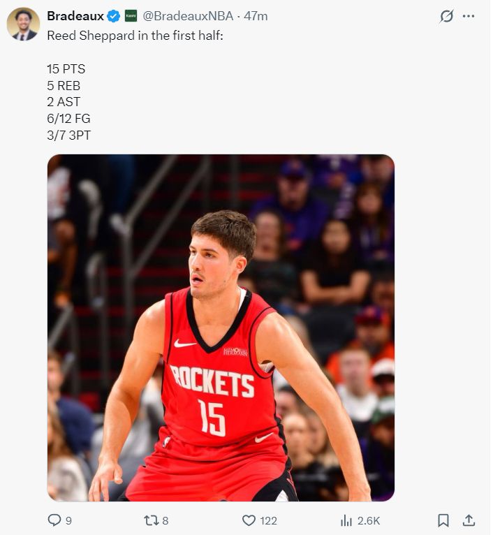 休媒:我的意思是,里德-谢泼德实际上为火箭队做了所有的事情。他能得分,能传球,能防守,还能抢篮板。