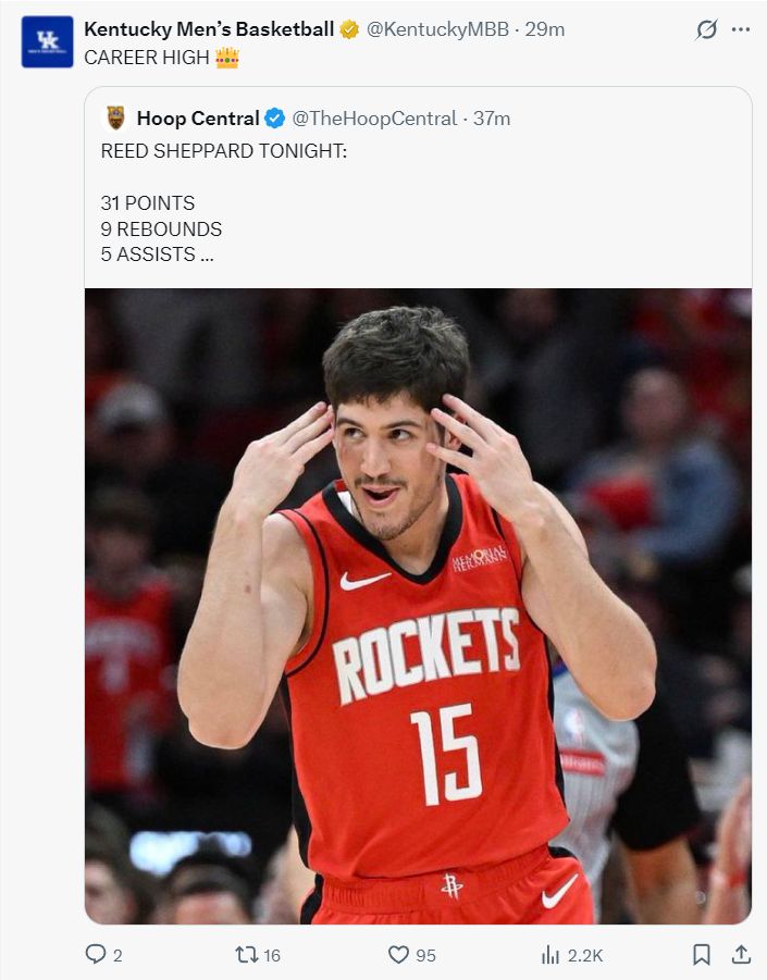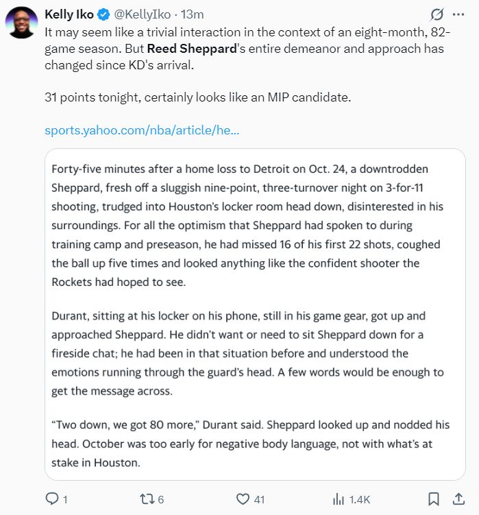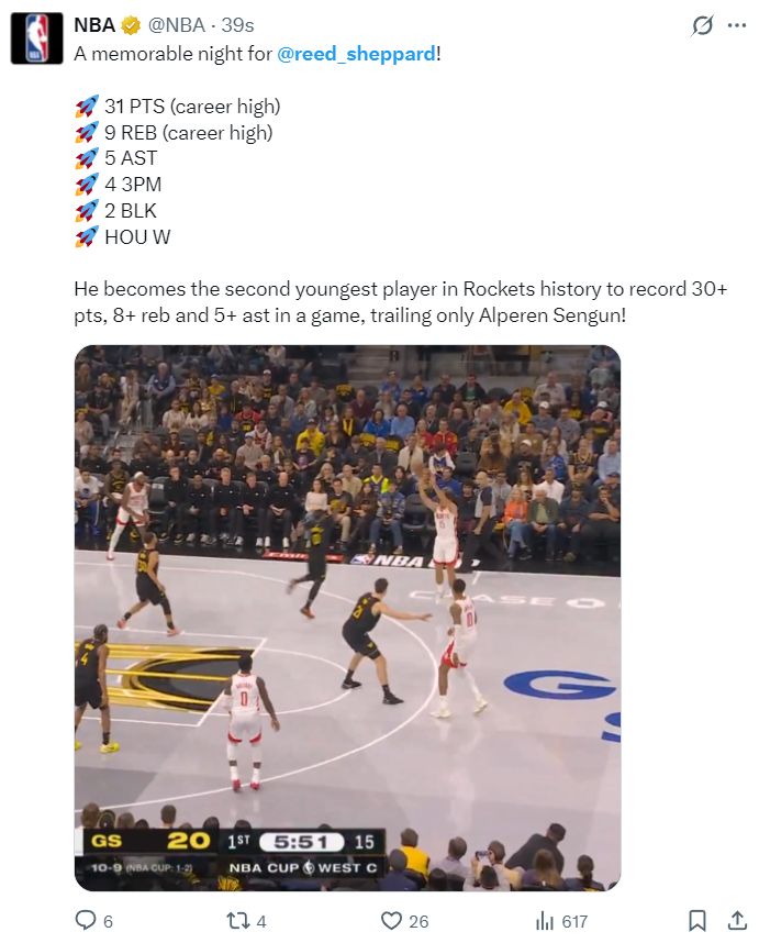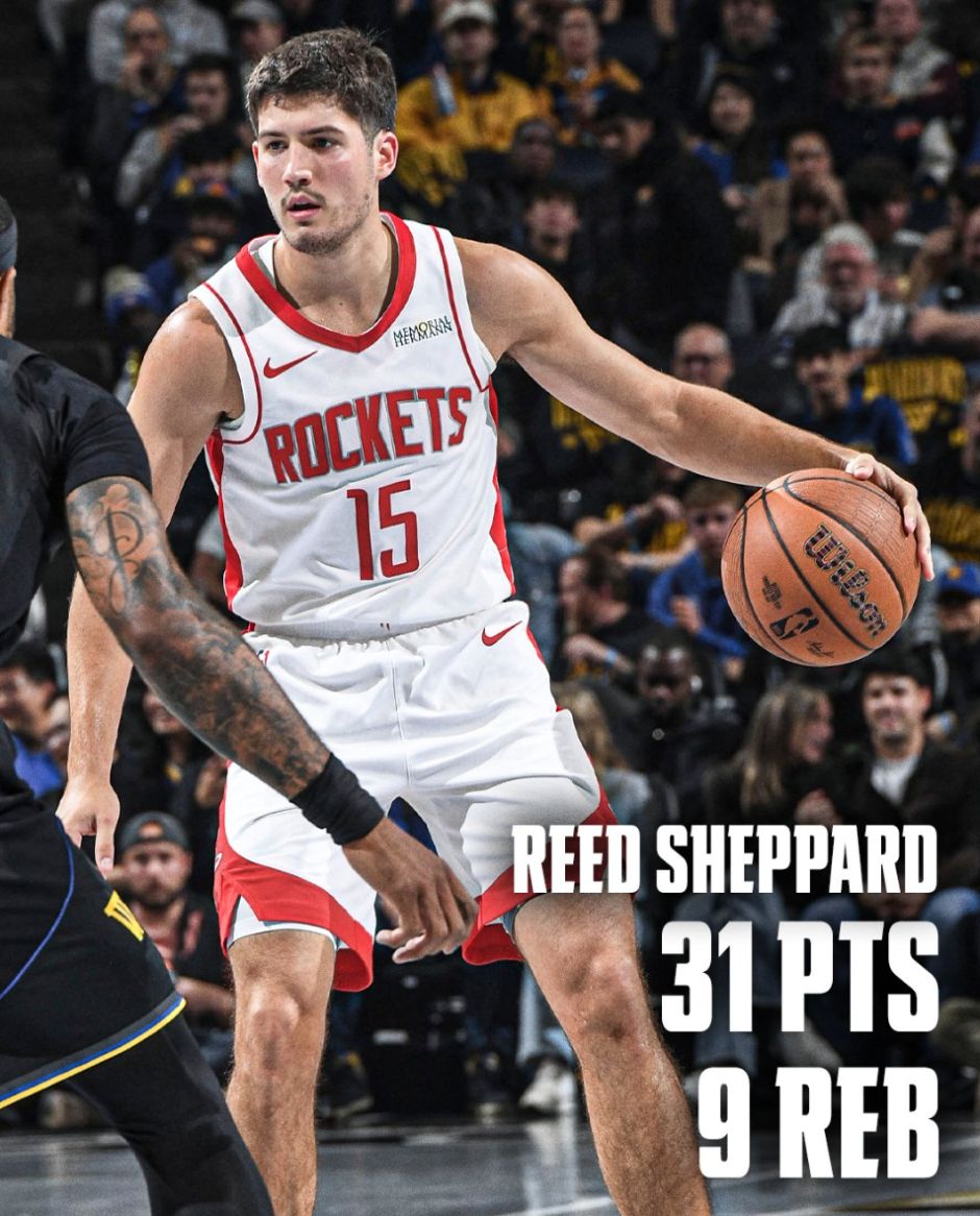 里德-谢泼德又迎来了生涯之夜,5天之前他刚刚在主场拿到27分生涯新高,5天后他在客场拿到31分9篮板再度创造生涯新高,得分、篮板都是生涯新高的,最关键的是他帮助火箭取胜,没有杜兰特+申京状态糟糕,二年级的小谢扶大厦之将倾,挽狂澜于既倒。
