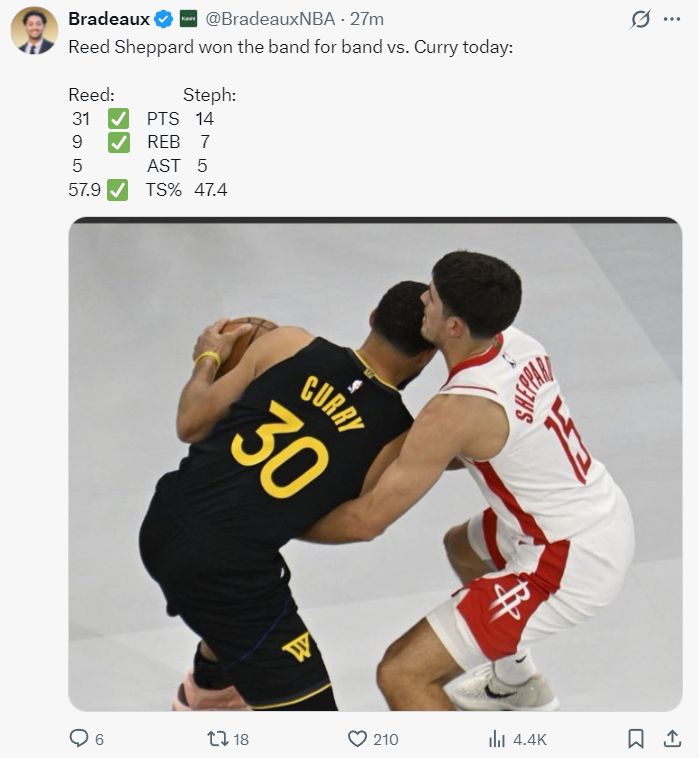 火箭记者Bradeaux晒出谢泼德与库里的数据,谢泼德得分、篮板、真实命中率都超过库里,这场比赛库里只有14+7+5+真实命中率47.4%。
