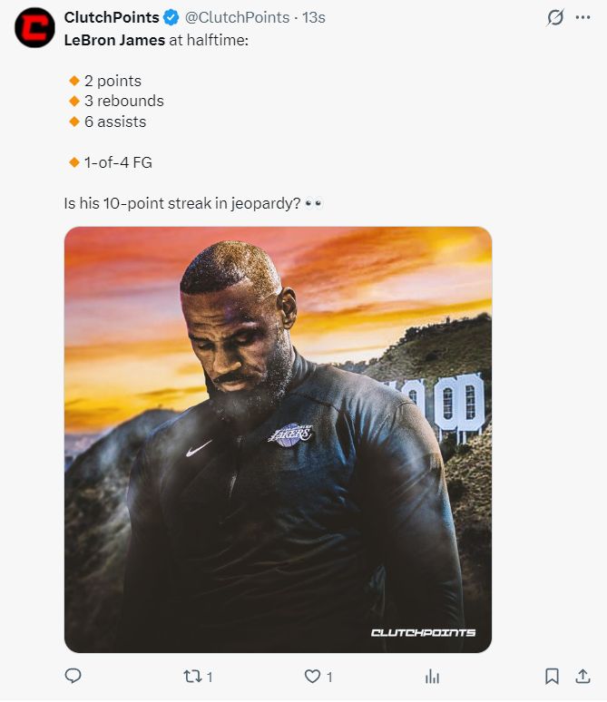 第二节勒布朗不断尝试中远投连连打铁,但勒布朗的传球还是非常具有侵略性,直接跨越半场空接助飞艾顿,勒布朗上半场打了16分24秒,4中1,三分1中0,拿到2分3篮板6助攻1抢断1盖帽1失误,勒布朗得分比弗拉格7分还少。