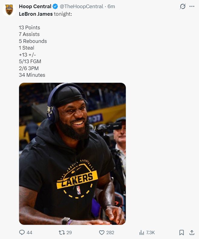 北京时间11月29日,NBA杯赛,湖人以129-119击败独行侠拿到6连胜。这场比赛东契奇+里夫斯合计拿到73分+10个三分球,这两人的进攻能力太强,老詹几乎是躺赢的,全场比赛只拿13+7+5,不过老詹正负值+13也不差。