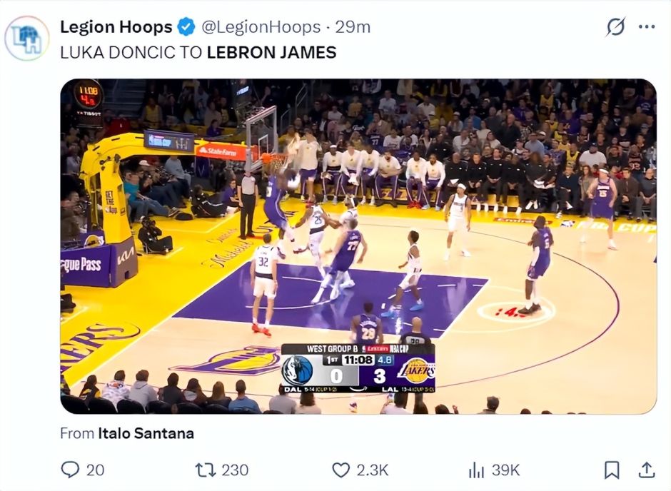 下个月即将年满41岁的勒布朗还是那么能飞,东契奇no look pass助攻老詹空切背扣,这个球也是老詹首节唯一一次出手。