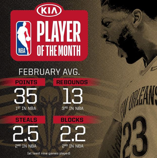 24直播网3月2日讯 NBA官方今天宣布,鹈鹕前锋安东尼-戴维斯当选上月西部最佳球员。随后鹈鹕官方更新了Instagram,祝贺戴维斯职业生涯首次当选月最佳。