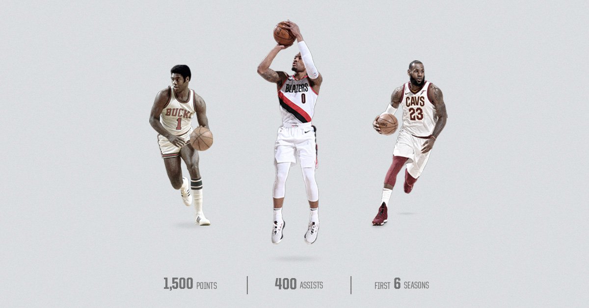 利拉德生涯前6个赛季均得到1500分400助攻,历史第3人