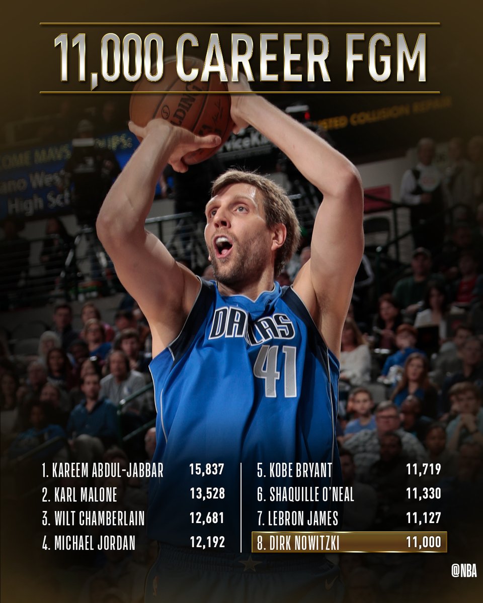 加上这4个进球,诺维茨基生涯运动战进球数突破了11000个,目前排在历史第8位。查看NBA总进球数排行榜>>