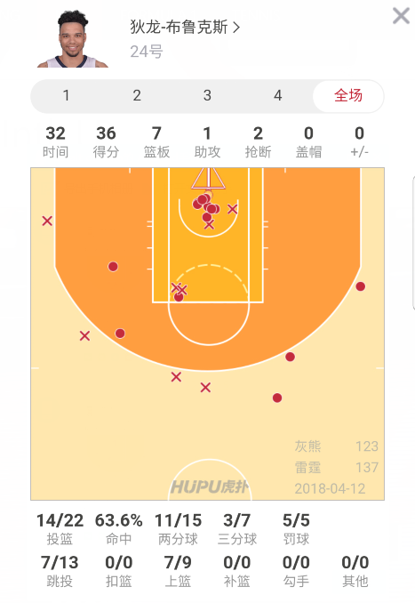 24直播网4月12日讯 在今天的比赛中灰熊123-137不敌雷霆,灰熊新秀狄龙-布鲁克斯本场比赛上场33分钟得到36分7篮板1助攻,这也刷新了他的生涯得分纪录。