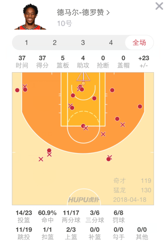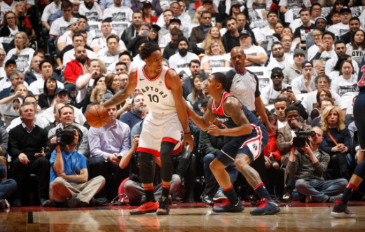 24直播网4月18日讯 猛龙今日在主场以130-119击败奇才,总比分2-0领先对手,猛龙球员德马尔-德罗赞本场比赛得到了37分,追平个人季后赛生涯单场得分纪录。