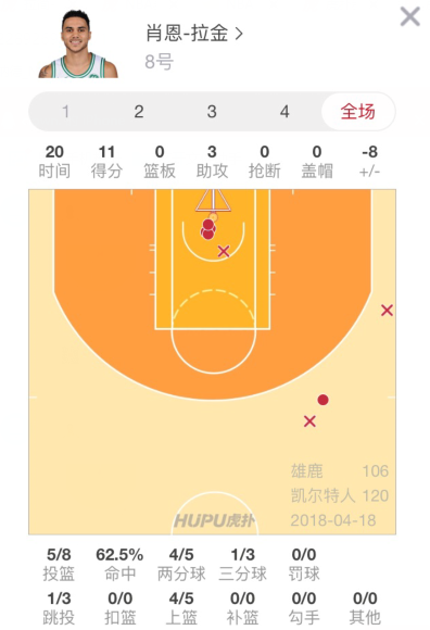 拉金此前的季后赛得分纪录是5分,他在季后赛首轮首场比赛中出场18分钟,4投2中得到5分1篮板2助攻1抢断。
