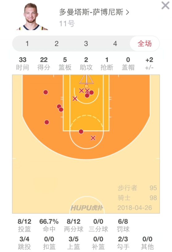 萨博尼斯本场比赛上场33分钟,12投8中,得到22分5篮板2助攻1抢断。