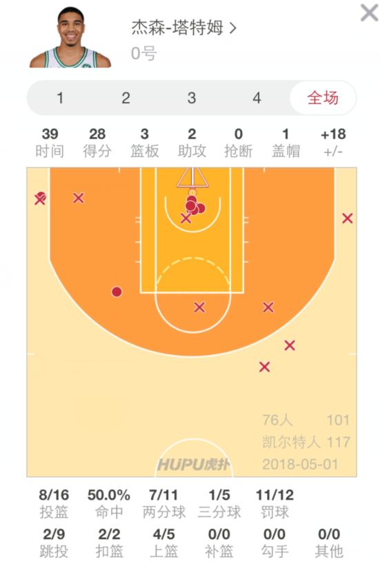 塔特姆本场比赛上场39分钟,16投8中,得到28分3篮板2助攻1盖帽。