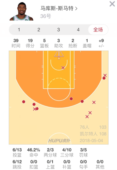 24直播网5月4日讯 凯尔特人在今天的比赛中以108-103战胜76人,系列赛大比分2-0领先76人。凯尔特人球员马库斯-斯马特出场39分钟,13投6中,其中三分球10投4中,得到19分5篮板3助攻2抢断1盖帽,创个人本赛季季后赛单场得分新高。