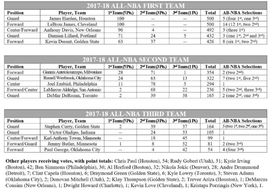 根据NBA官方公布的投票结果,哈登和詹姆斯全票(100票)入选了最佳一阵。戴维斯获得了96张一阵选票和4张二阵选票;利拉德获得了71张一阵选票、24张二阵选票和5张三阵选票;杜兰特获得了63张一阵选票和27张二阵选票。