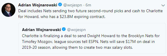 沃神在社交媒体发布消息,黄蜂将送出“魔兽”,得到篮网的莫兹科夫、两个未来的次轮选秀权和部分现金补偿,篮网将在2019-20赛季腾出1700万美元的薪金空间,使得他们有足够的薪资空间签下2份顶薪合同。