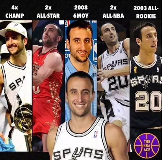 1057场常规赛,场均25.4分钟,13.3分,3.5篮板,3.8助攻,1.3抢断!如果这样还不够有说服力,那么4次获得总冠军,2次入选全明星,2次最佳阵容,1次赢得最佳第六人!作为一名生涯大部分时间以替补出战的球员,马努伟大的!而关于马刺更是有着“顺境看邓肯,逆境看帕克,绝境看马努!”的真传!