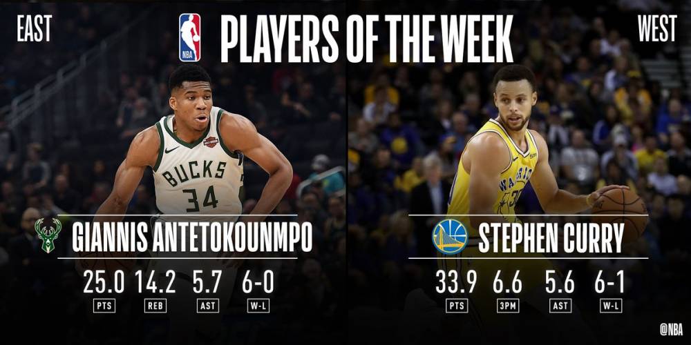 24直播网10月30日讯 据NBA官推报道,字母哥和库里分别当选新赛季第二周东西部最佳球员。