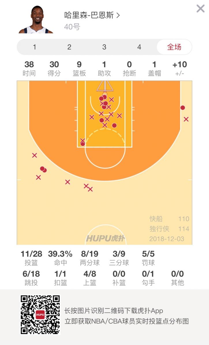 24直播网12月3日讯 独行侠今日常规赛在主场以114-110战胜快船,本场比赛独行侠前锋哈里斯-巴恩斯得到30分创造了个人本赛季单场得分新高。