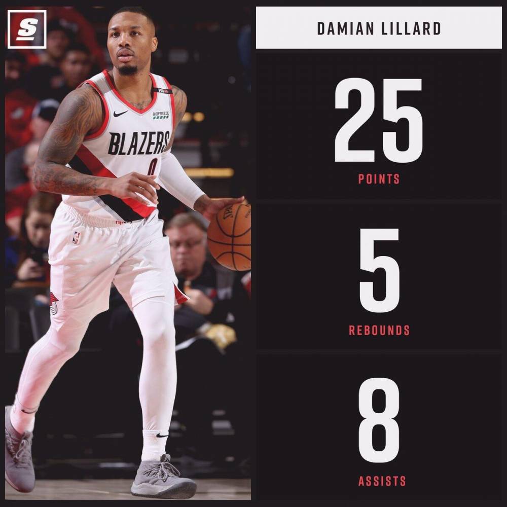 本场比赛,开拓者当家球星达米安-利拉德发挥尚可,出战27分钟,14投8中,三分5中3,罚篮7中6,拿下25分5篮板8助攻1抢断1封盖,正负值高达+31,一人爆掉太阳整个后卫线,太阳首发的后卫米卡尔-布里奇斯和埃利-奥科博两人共19投8中,三分球6投2中,拿到18分8个篮板和2次助攻。