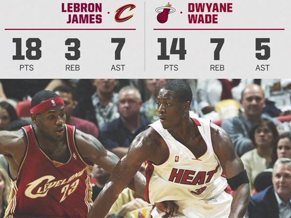 在2003年11月13日的比赛中,詹姆斯与韦德第一次交手,詹姆斯得到了18分3篮板7助攻,韦德得到了14分7篮板5助攻。