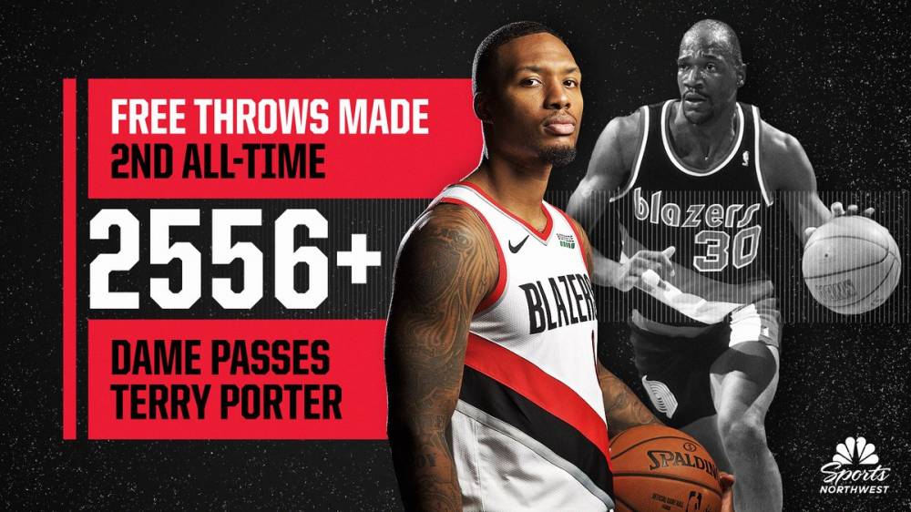 赛前,利拉德开拓者生涯罚球命中数2554个。而在本场比赛,利拉德出战39分钟25投12中,三分球7中4、罚球7中6,拿下34分2篮板2助攻。这样一来,利拉德的罚球命中数来到2561个,超越特里-波特(2555)升至队史第二,排名第一的是德雷克斯勒(3798个)。