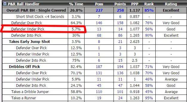 忌惮于他出色的持球投能力,本赛季当欧文发起挡拆的时候,对方仅有5.7%的比例会选择绕防(放投防突),他的这项数据比库里还低。