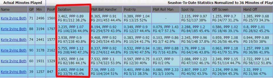 作为一名现代性的后卫,欧文有着出色的中远距离持球投能力。最近6个赛季,他的持球投每回合得分都至少能超越联盟77%以上的球员。今年虽然有所下滑(可能受到了赛季初状态不佳的影响),但依然可以超过联盟71%的球员。