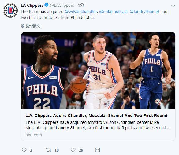 具体交易内容为:快船和76人达成交易,快船送出托拜厄斯-哈里斯、迈克-斯科特、博班-马扬诺维奇得到兰德里-沙梅特、威尔森-钱德勒、穆斯卡拉以及两个首轮选秀权和两个次轮选秀权。