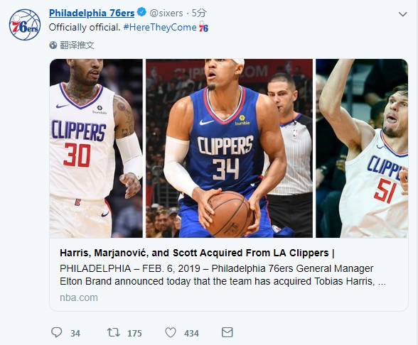 24直播网2月7日讯 快船与76人两队均官方宣布完成交易。