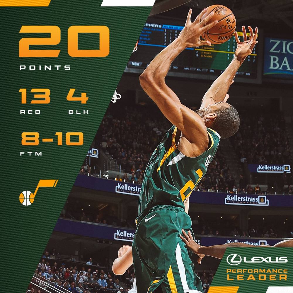 本场戈贝尔出战34分钟,全场9中6,罚球10中8,贡献20分13篮板4盖帽2助攻。
