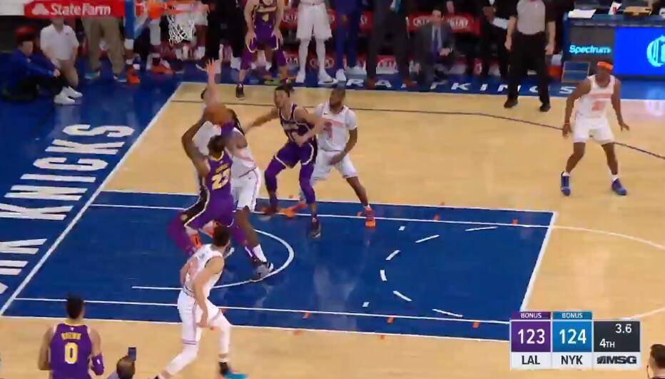 24直播网3月18日讯 今日,尼克斯在主场以124-123险胜湖人。在比赛最后一刻,湖人前锋詹姆斯持球执行最后一攻,面对海佐尼亚的防守突破至内线跳投,不料遭遇后者的正面封盖,最终遗憾输球。GIF-海佐尼亚正面封盖詹姆斯