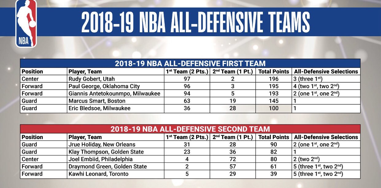 最佳防守阵容一阵的5人分别是:鲁迪-戈贝尔(爵士队)、保罗-乔治(雷霆队)、扬尼斯-阿德托昆博(雄鹿队)、马库斯-斯马特(凯尔特人队)、埃里克-布莱德索(雄鹿队)。