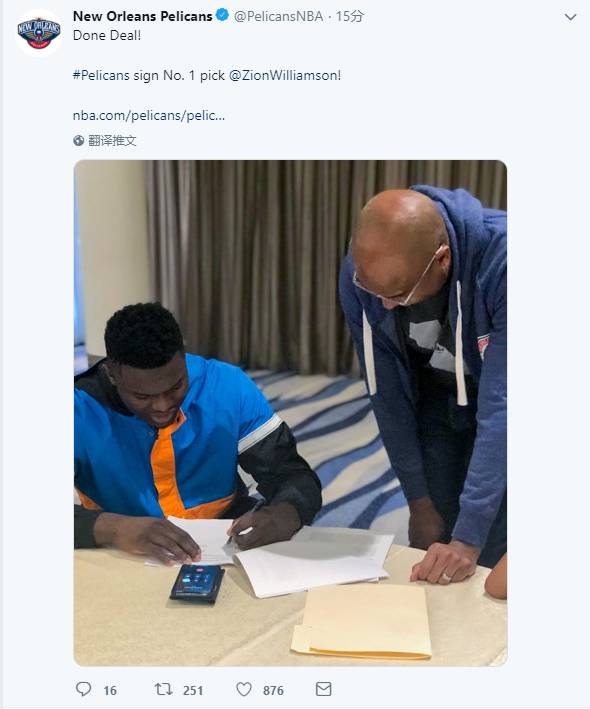 正式签约!鹈鹕官推晒与锡安签约照